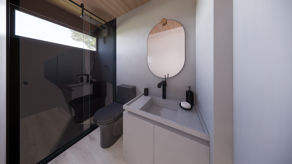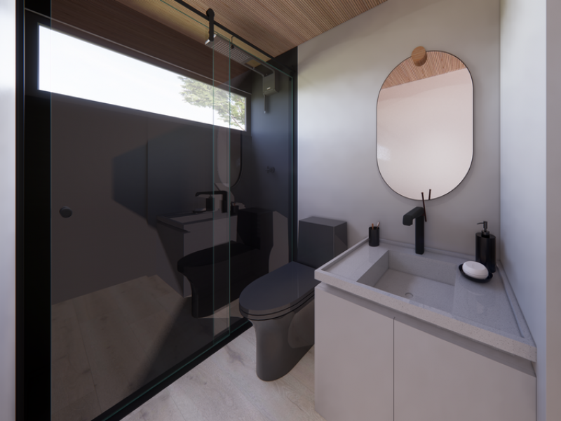 - Área molhada do chuveiro em bandeja inox com acabamento em granito ou deck madeira